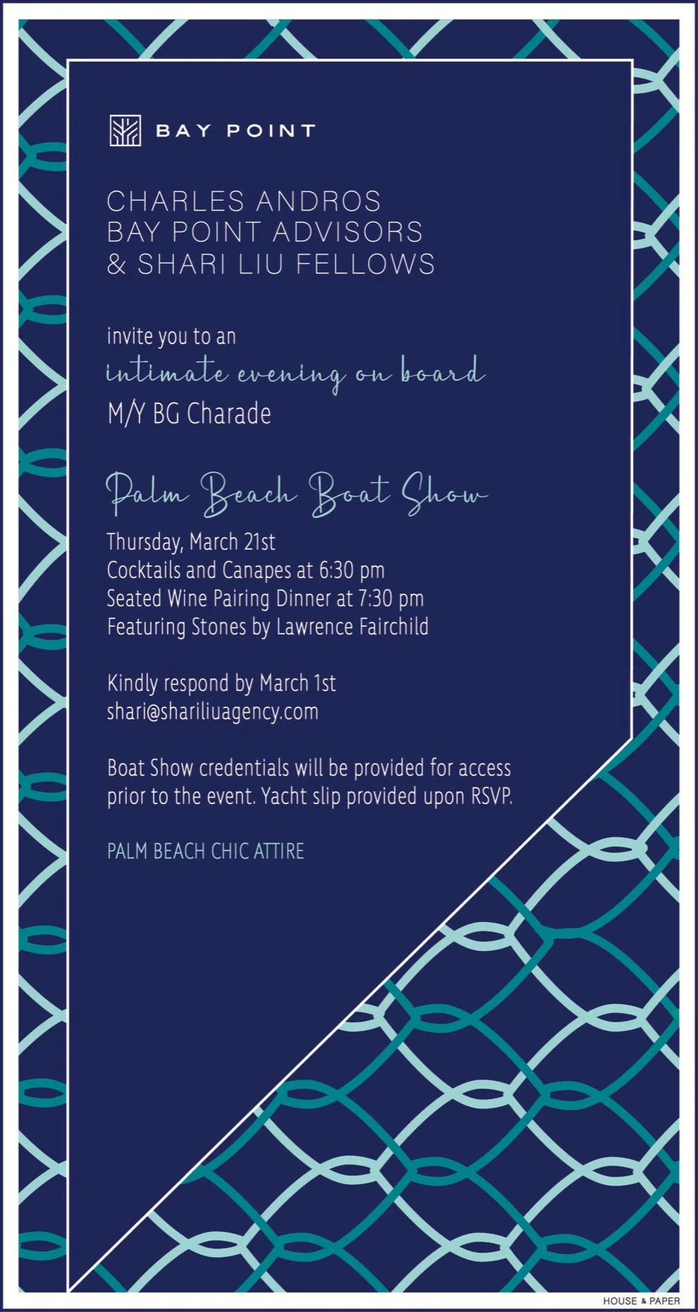 SLA and Charles Andros Bay Point Advisors hosted a wonderful evening on board motor yacht BG CHARADE at the Palm Beach International Boat Show 2024 (PBIBS).